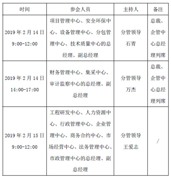 三、【時間】:2019 年 2 月 14 日-15 日,具體安排見“具體安排” 。四、【地點】:集團(tuán)總部二樓會議室
