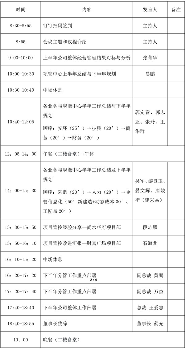 4. 各部門和項目部需在一周內(nèi)分別召開內(nèi)部專題會,傳達年中經(jīng)營會會議精神,部署下半年重點工作,明確實施計劃與分工,抓好各項工作的落實。