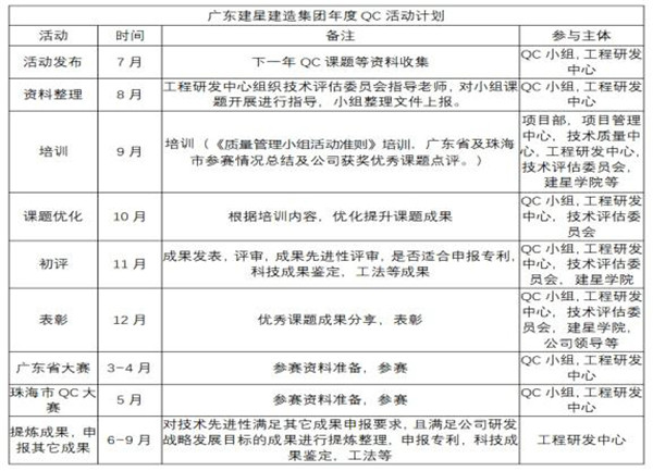 質(zhì)量是企業(yè)的生存命脈,創(chuàng)新是企業(yè)的動(dòng)力源泉。為了營造創(chuàng)新氛圍,激發(fā)創(chuàng)新活力,提升質(zhì)量意識(shí),弘揚(yáng)QC小組持續(xù)改進(jìn)、精益求精的精神,同時(shí)提升科技研發(fā)的系統(tǒng)性和發(fā)揮技術(shù)評(píng)估委員會(huì)的技術(shù)評(píng)估作用,集團(tuán)將開展以“質(zhì)高無上,量出新穎”為主題的年度系列QC活動(dòng)。年度活動(dòng)安排具體如下: