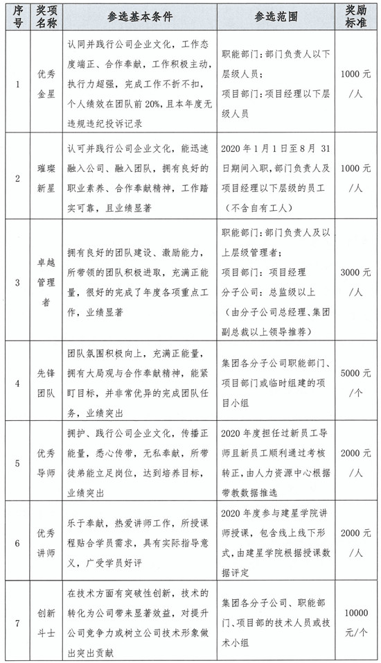 備注:獎項1、3的參選人員需是2020年1月1日之前入職且連續(xù)工作滿1年的員工。