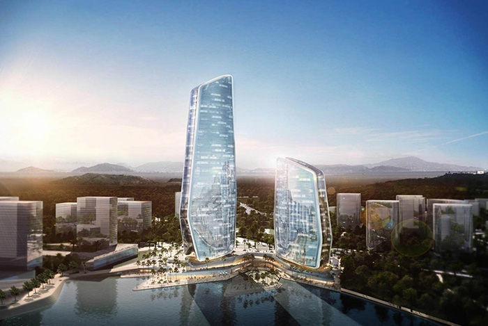 項目位于金灣西湖片區(qū)啟動區(qū),山湖海路南側,金鑫路西側??偨ㄖ娣e約171736.28平方米,呈“雙子塔”建筑群。其中,1#塔樓建筑高度約186米,共41層,建筑面積約8萬平米;2#塔樓150米,共39層,建筑面積約2.8萬平米。塔樓規(guī)劃功能包括國際標準甲級寫字樓、五星級酒店、商業(yè)配套設施等。