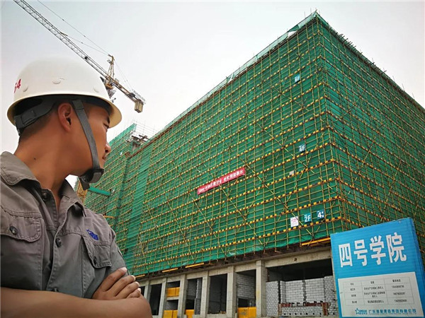 珠海的天氣高溫多雨,潮濕漫長(zhǎng)。從四季分明的城市來(lái)到這里,起初我特別不適應(yīng)。每天的戶外一線施工作業(yè)對(duì)我而言如同蒸了整整一天的桑拿,毒辣的太陽(yáng)、汗?jié)竦墓ひ掠绕渥屓四臒┰?。然而高空作業(yè)注意力必須高度集中,容不得一點(diǎn)馬虎和疏漏。當(dāng)時(shí)心里就一個(gè)想法,無(wú)論遇到什么困難,必須堅(jiān)持下去,為項(xiàng)目高質(zhì)量完成保駕護(hù)航。整個(gè)漫長(zhǎng)的夏天從開(kāi)始的咬牙堅(jiān)持到逐漸的適應(yīng),四號(hào)學(xué)院就像一個(gè)我親手養(yǎng)育的孩子慢慢長(zhǎng)大成人。