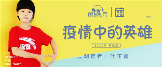 傾聽“星”聲,記錄美好。建星【朗讀月】第三季——我的戰(zhàn)疫日記,讓我們跟隨朗讀者的文字和聲音一起記錄這段特殊時期的感動點滴,用愛傳遞抗“疫”力量。歡迎收聽【朗讀月】第三季第三期《疫情中的英雄》,朗讀者:葉芷菁 。